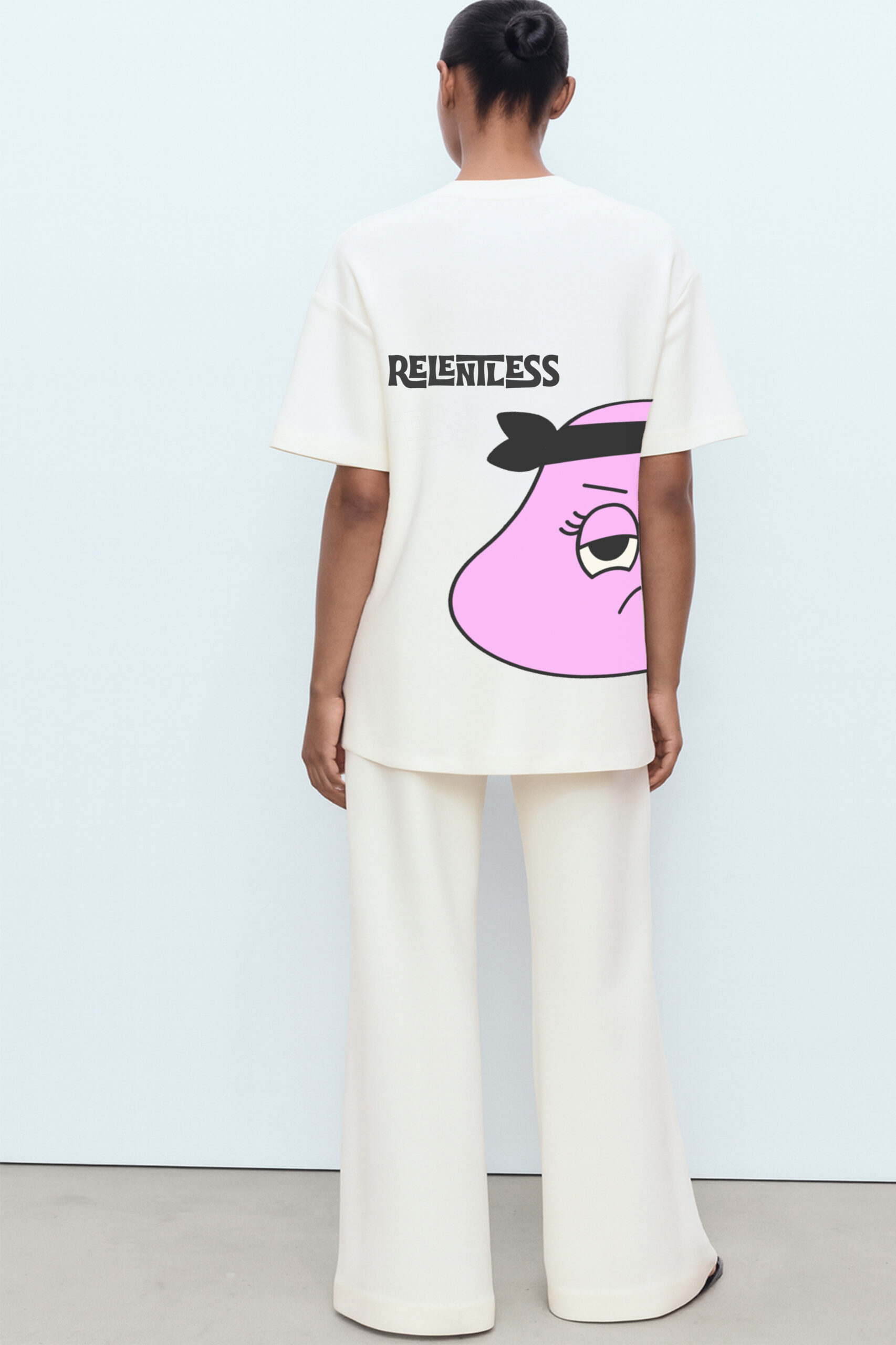 With a minimalist front and a bold, oversized back print featuring Rahraha’s half-face icon and the word “Relentless”, this piece captures the soul of the unstoppable.